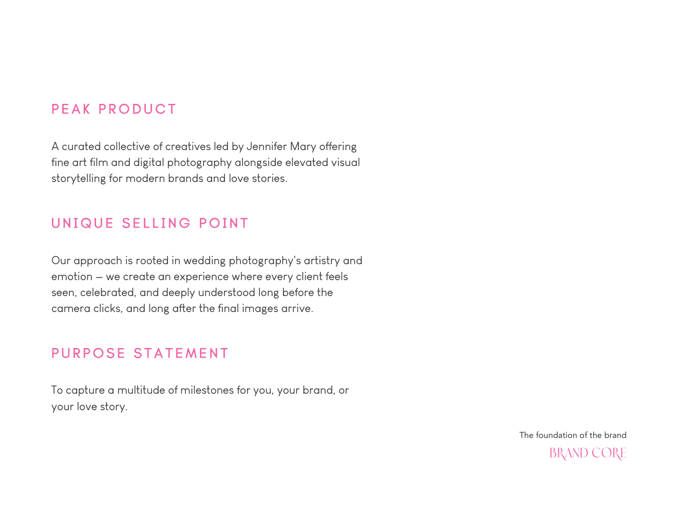 We developed a clear, concise narrative that communicates Jen’s unique ability to create experiences where clients feel seen, celebrated, and deeply understood long before the camera clicks, and long after the final images are delivered.