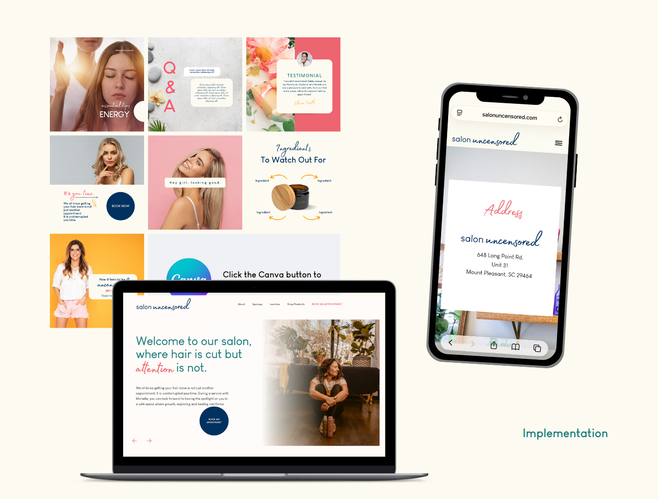 We integrated the new branding into the website build to better align with her as a Stylist + Reiki Master. See full website at https://www.salonuncensored.com/